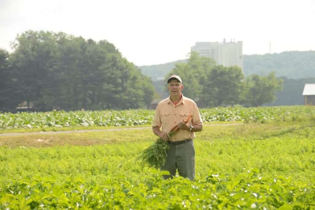 In a field of carrots with a view of the UMass Lederle Graduate Research Tower.