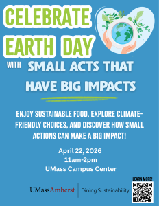 Join us on Wednesday April 22nd from 11 AM–2 PM at the Campus Center for a day of sustainable eats and inspiration. Stop by Harvest Market for a featured climate-friendly menu, enjoy free tastings, grab some giveaways, and explore simple ways to make more climate-conscious choices.