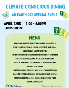 Celebrate Earth Day with us at Hampshire Dining Commons on April 22 from 5–9pm as we serve up a low carbon impact menu that’s delicious and sustainable. Visit the Climate Conscious Learning Hub from 5–7pm in the Hampshire Room, where you can learn about the Carbon Rating on the Menu, the environmental impact of different foods, and pick up tips for making climate-friendly choices every day. Small acts, big impacts!