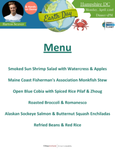 Join us for a delicious Earth Day dining experience, where sustainability takes center stage! Join us on Monday April 22nd from 5-9pm at Hampshire Dining Commons to indulge in a delightful menu featuring responsibly sourced seafood, carefully selected to support healthy oceans and marine ecosystems.