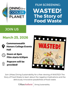 The UMass Dining Sustainability Team is excited to host a Dining for a Cooler Planet film screening at the Commonwealth Honors College Events Hall on Wednesday, March 25, 2026. The film WASTED! The Story of Food Waste dives into the negative implications and the deliciously innovative possibilities of food waste. Doors to the Events Hall will open at 6:00pm and the film screening will start at 6:30pm. This event is open and free to all UMass community members. Popcorn will be provided!
