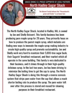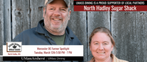 Join us for a Farmer Spotlight dinner event featuring UMass Dining’s local farm partner, North Hadley Sugar Shack. We’re excited to showcase the journey of tree to table and indulge in the pure sweetness of locally produced maple syrup! Owners, Joe and Shelly Boisvert, will be joining us to share their journey and tell the story of North Hadley Sugar Shack. Join us at Worcester Commons from 5:30-7:30pm for an evening of celebrating the connection between our dining tables and the thriving local farms that enrich our UMass community!