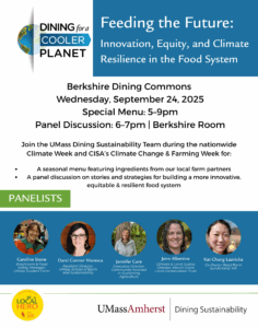 The UMass Dining Sustainability Team is excited to kick off the fall 2025 semester with a Dining for a Cooler Planet event at Berkshire Dining Commons on Wednesday, September 24. The event, Feeding the Future: Innovation, Equity, and Climate Resilience in the Food System will take place during the nationwide Climate Week and the local Climate Change and Farming Week led by CISA. The event will feature a special menu from 5–9pm, that will showcase seasonal ingredients from our regional partners. We will also have a panel discussion from 6–7pm in the Berkshire Room. The panel will bring together farmers, advocates, professors, and other food system professionals to share firsthand stories and perspectives on building a more innovative, equitable, and resilient food system. Join us for an evening of delicious local food and meaningful conversation.