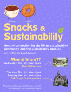 Monthly connection for the UMass Sustainability community and the sustainability curious with coffee, tea, bagels, and more!