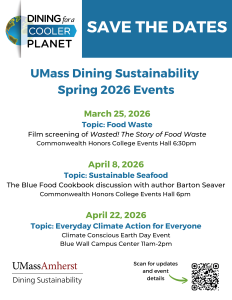 Join UMass Dining Sustainability this spring for a lineup of engaging events exploring how food choices connect to climate action. From a powerful documentary screening on food waste in February, to an April conversation on sustainable seafood with author Barton Seaver, and an Earth Day celebration focused on everyday climate actions, these events invite students and staff to learn, taste, and take action. Check back for details as the events get closer!
