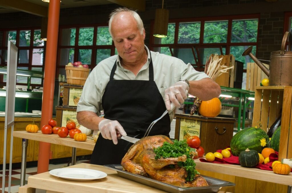 Peter Diemand slicing and serving his own Diemand farm-raised turkey at Worcester Dining Hall.