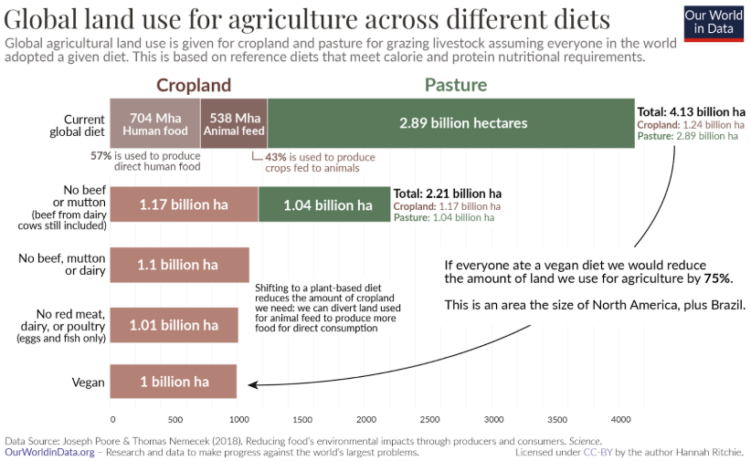 The next best option is almost always smaller animals, starting with fish and poultry and working your way up to mutton and beef. This is because smaller animals tend to be more efficient converters of protein that we them into the meat and dairy that we eat. As an example: beef has an energy efficiency of about 2%. This means that for every 100 kilocalories you feed a cow, you only get 2 kilocalories of beef back. In general, we see that cows are the least efficient, followed by lamb, pigs then poultry. To get a sense of the scale, we would half the amount of crop land we currently use if we stopped eating beef and mutton, even while still drinking dairy.