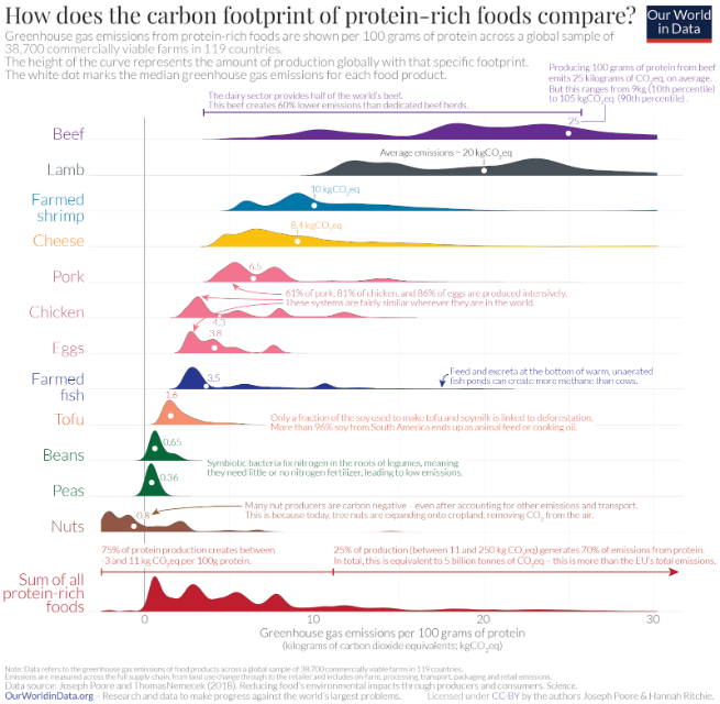 Regardless of whether you compare the footprint of foods in terms of calories or per gram of protein, the overall conclusion is the same. Plant-based foods tend to have a lower carbon footprint than meat and dairy. In many cases, a much smaller footprint.